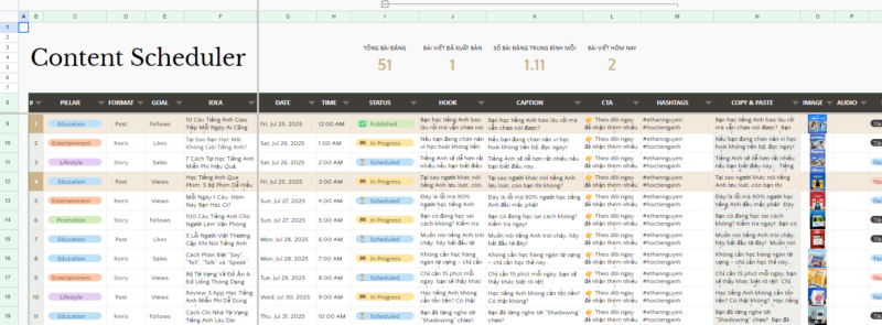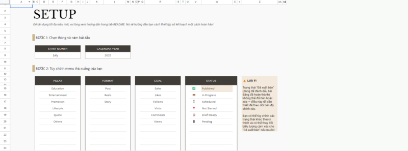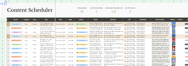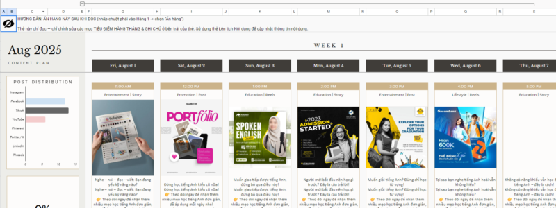 Phù hợp cho content creator, influencer, coach, hoặc chủ doanh nghiệp nhỏ, công cụ này được thiết kế trên Google Sheets và Excel, hỗ trợ bạn tổ chức nội dung hiệu quả và xuất hiện trên mạng xã hội một cách nhất quán, tự tin.