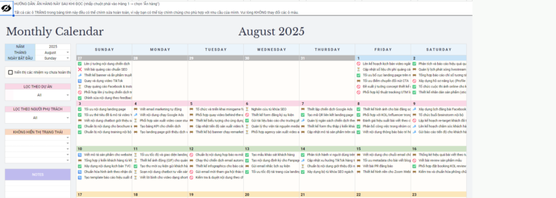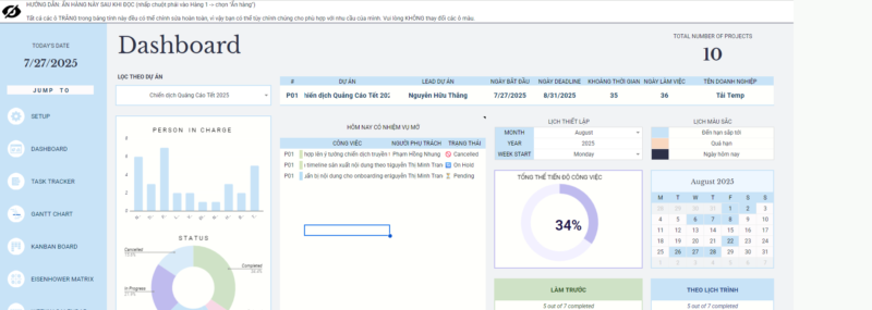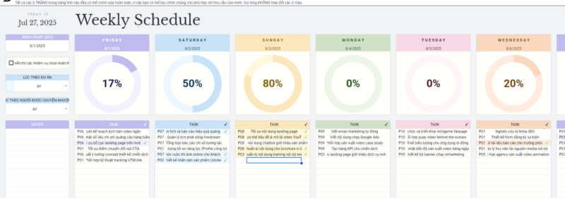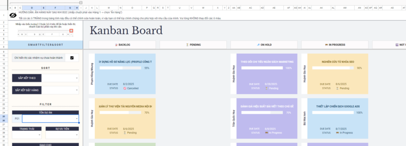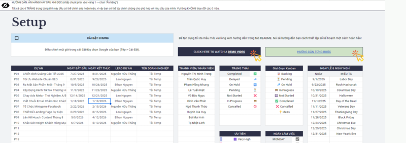 Project & Task Manager là mẫu bảng tính được thiết kế tối ưu dành cho nhóm nhỏ, freelancer và doanh nghiệp vừa – giúp bạn quản lý nhiều dự án, theo dõi tiến độ, lên kế hoạch nhóm và cộng tác hiệu quả trên cùng một nơi.