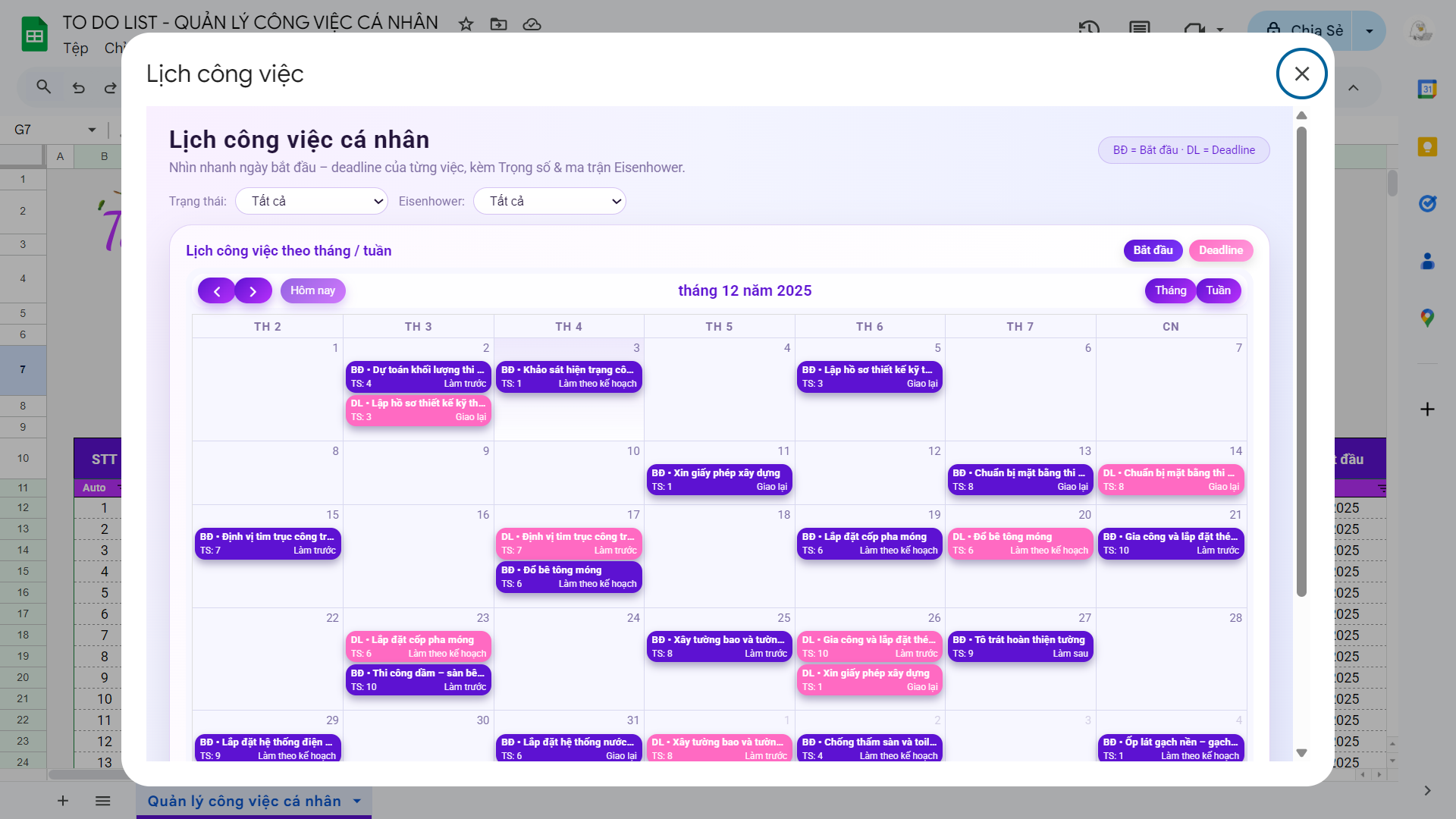 File Google Sheet TO DO LIST – Quản lý công việc cá nhân đi kèm lịch Calendar: