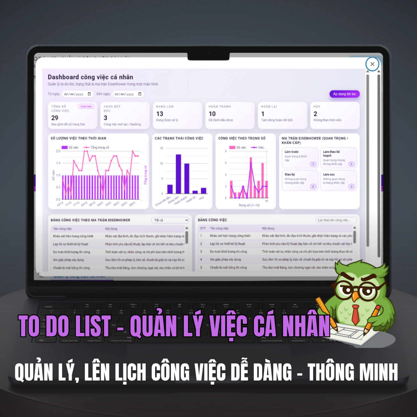 Không chỉ là to do list, file còn có Dashboard báo cáo trực quan, cho phép bạn: